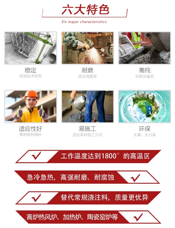 以多孔莫來石骨料為原料,外加細(xì)粉和添加劑攪拌成的耐火澆注料,該澆注料具有施工方便,結(jié)構(gòu)整體性好、高強(qiáng)、致密、抗侵蝕、耐沖刷、抗磨損、使用壽命長,適合于(加熱爐、CFB鍋爐、熱風(fēng)爐、余熱發(fā)電鍋爐、垃圾梵燒爐等)。