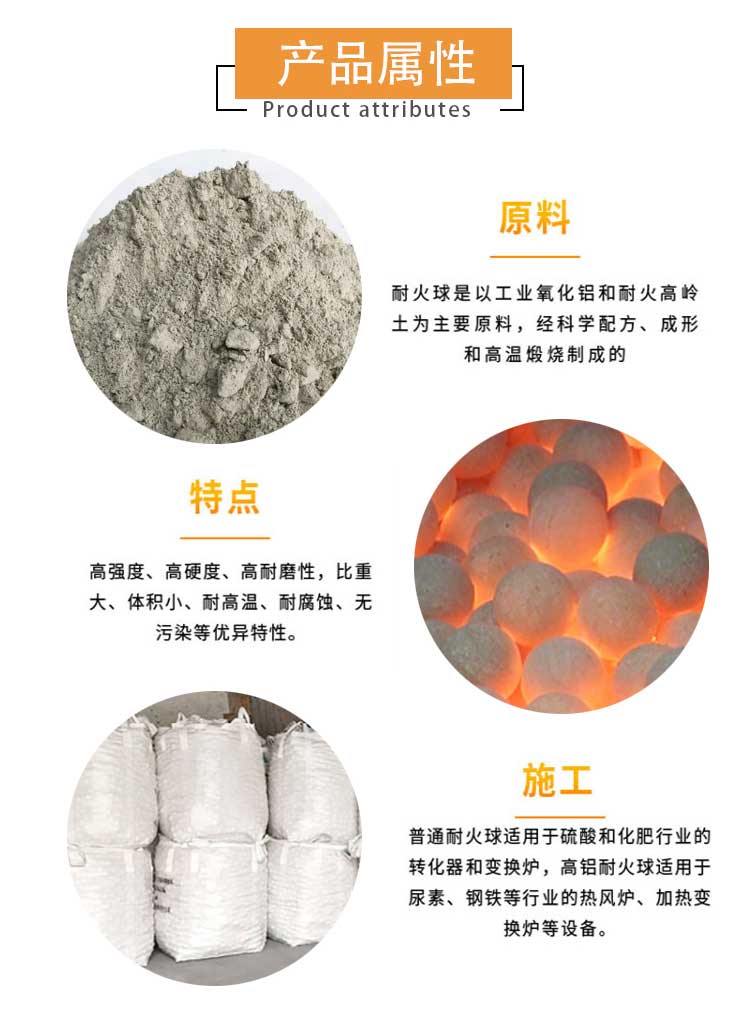 耐火瓷球分普通耐火球和高鋁耐火球,普通耐火球適用于硫酸和化肥行業(yè)的轉(zhuǎn)化器和變換爐,高鋁耐火球適用于尿素、鋼鐵等行業(yè)的熱風(fēng)爐、加熱變換爐等設(shè)備。